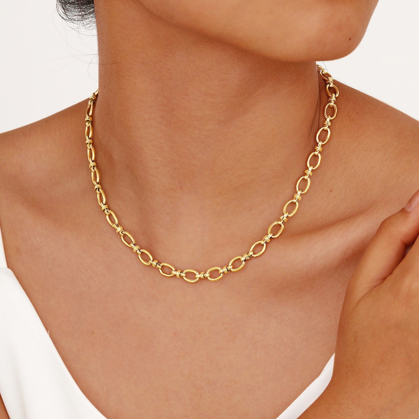Das besondere Gliedermuster verleiht der Kette eine strukturierte und gleichzeitig elegante Ausstrahlung. Die polierte Oberfläche reflektiert das Licht dezent und setzt modische Akzente – ideal als Statement-Piece oder in Kombination mit schlichteren Accessoires. Die hochwertige Vergoldung bleibt farbstabil, während der Edelstahl für Langlebigkeit und angenehmen Tragekomfort sorgt.