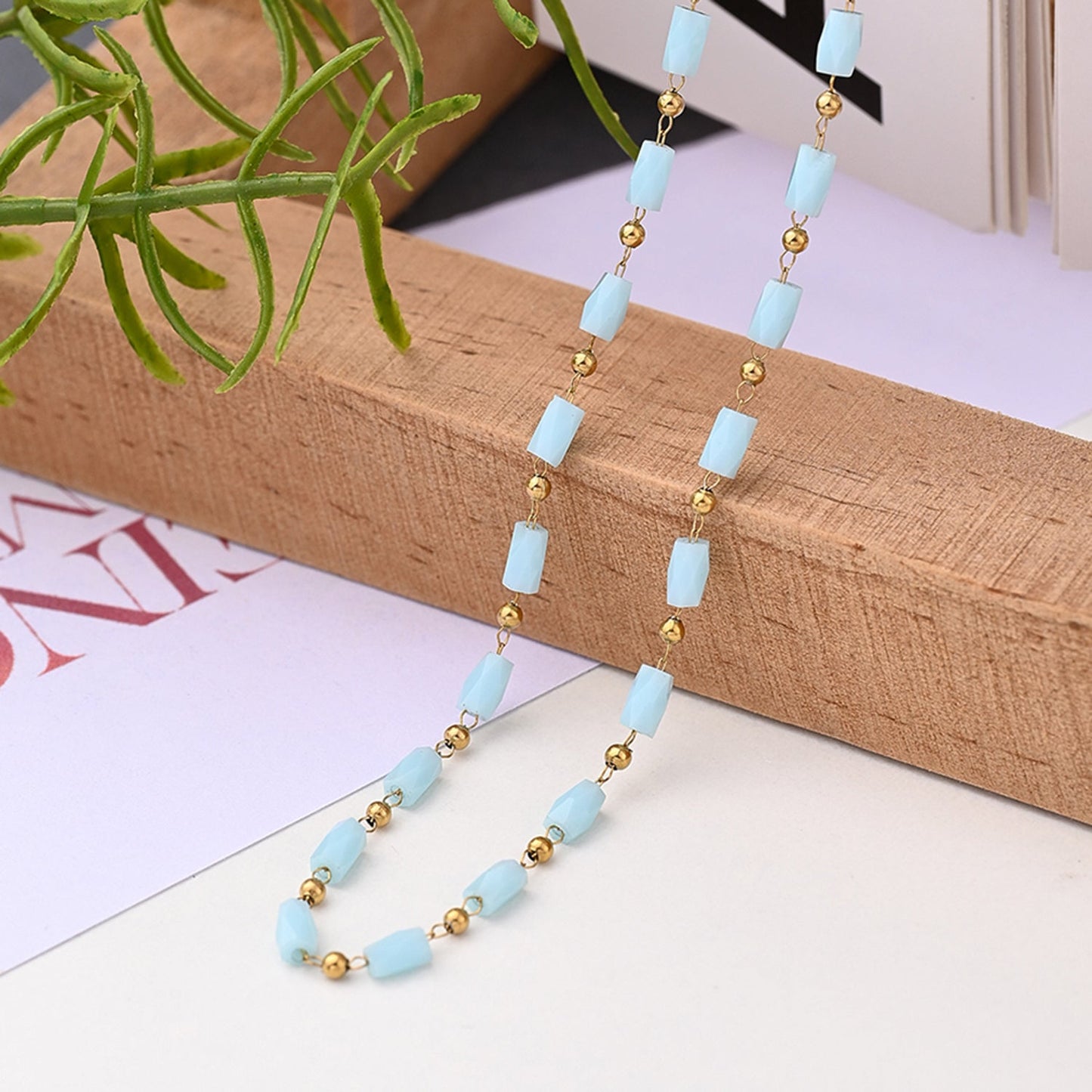 Zarte, türkisfarbene Perlen in Röhrchenform wechseln sich gleichmäßig mit kleinen goldfarbenen Kügelchen ab und sorgen für ein frisches, sommerliches Gesamtbild. Die Kombination aus Türkis und Gold wirkt edel und gleichzeitig lässig – ideal, um jedes Outfit im Handumdrehen aufzuwerten.