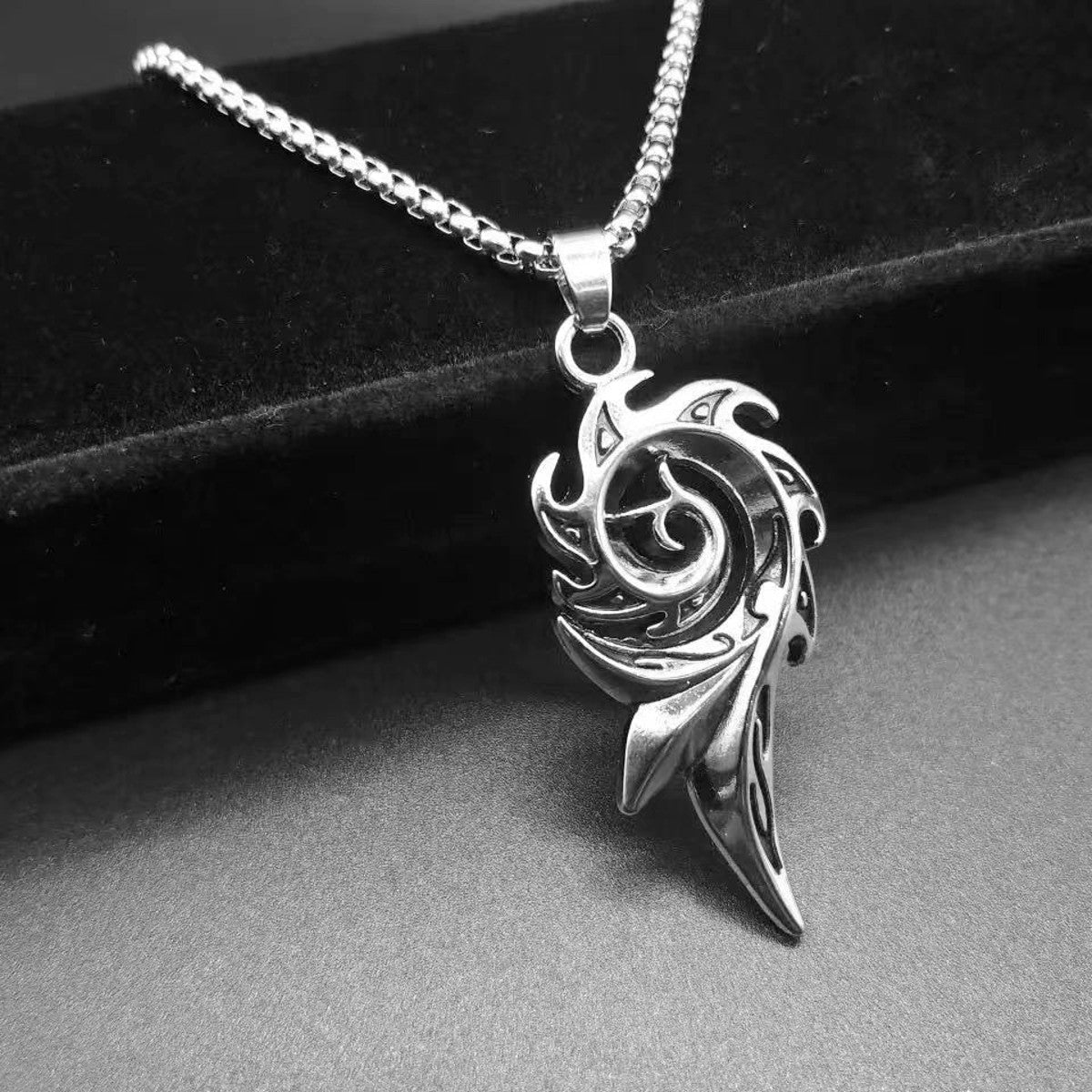 Der Anhänger in einem dynamischen, kunstvollen Design misst 5 x 2,2 cm und zieht alle Blicke auf sich. Seine raffinierte Form verleiht jedem Outfit einen markanten und maskulinen Akzent. Der Karabinerverschluss sorgt dafür, dass die Kette sicher am Platz bleibt und leicht zu handhaben ist.