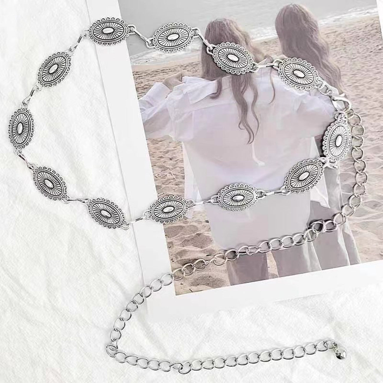 Die fein verzierten Medaillons (3 x 1,8 cm) bilden eine durchgehende Kette, die mit ihrer strukturierten Oberfläche sofort ins Auge fällt. Der Gürtel ist 60 cm lang und lässt sich mithilfe einer 48 cm langen Verlängerungskette auf bis zu 108 cm anpassen – ideal für unterschiedliche Figurtypen und Stylingwünsche.