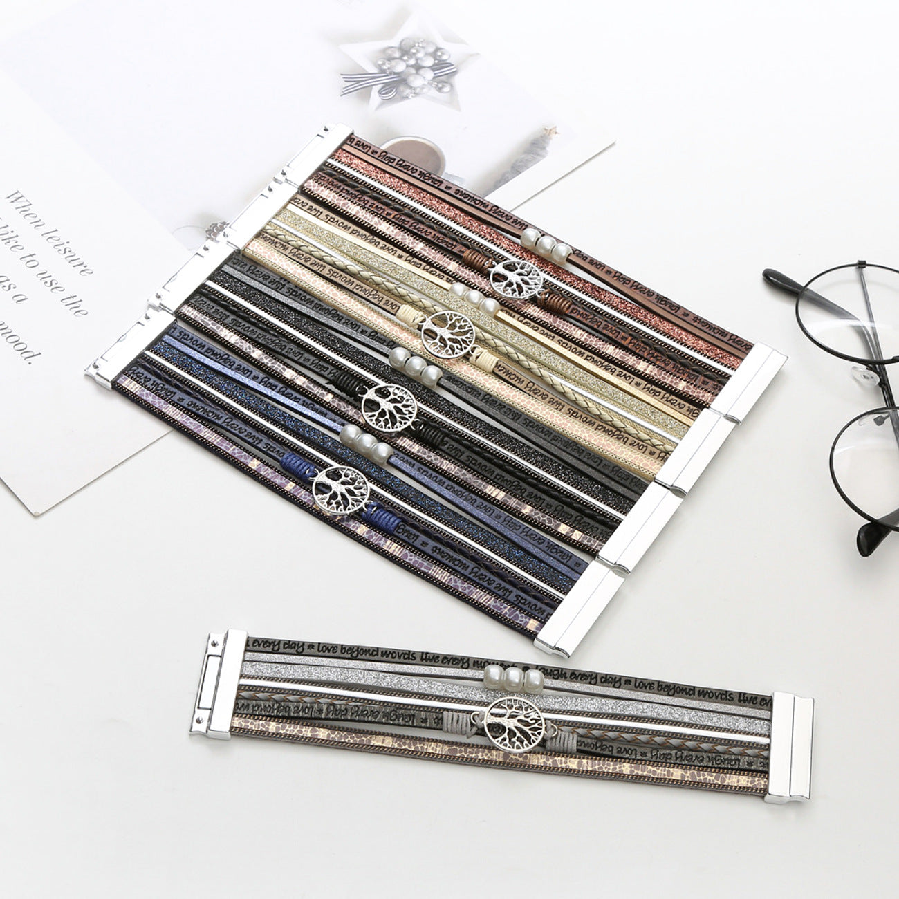 Dieses elegante Damenarmband von Karma kombiniert stilvolles Design mit symbolischer Bedeutung. Der detailreiche Tree of Life-Anhänger steht für Wachstum, Stärke und Verbundenheit. Gefertigt aus langlebigem PU-Leder, vereint das Armband verschiedene Strukturen, schimmernde Akzente und liebevolle Gravuren wie "Live every moment, laugh every day, love beyond words".