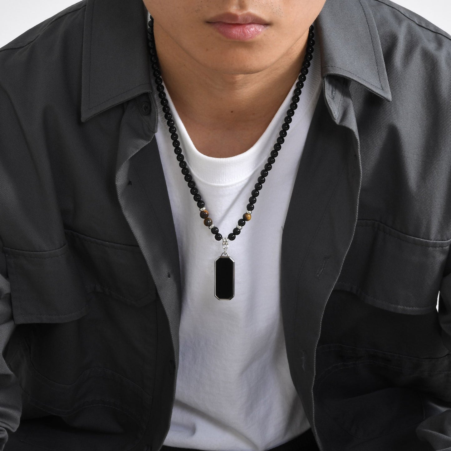 Die dunklen, glänzenden Farben der Perlen harmonieren perfekt mit dem Anhänger und verleihen Ihrem Look eine coole, maskuline Note. Mit einer Breite von 0,6 cm bleibt die Kette dezent, wirkt jedoch durch ihre Material- und Farbkombination zugleich eindrucksvoll und edel.