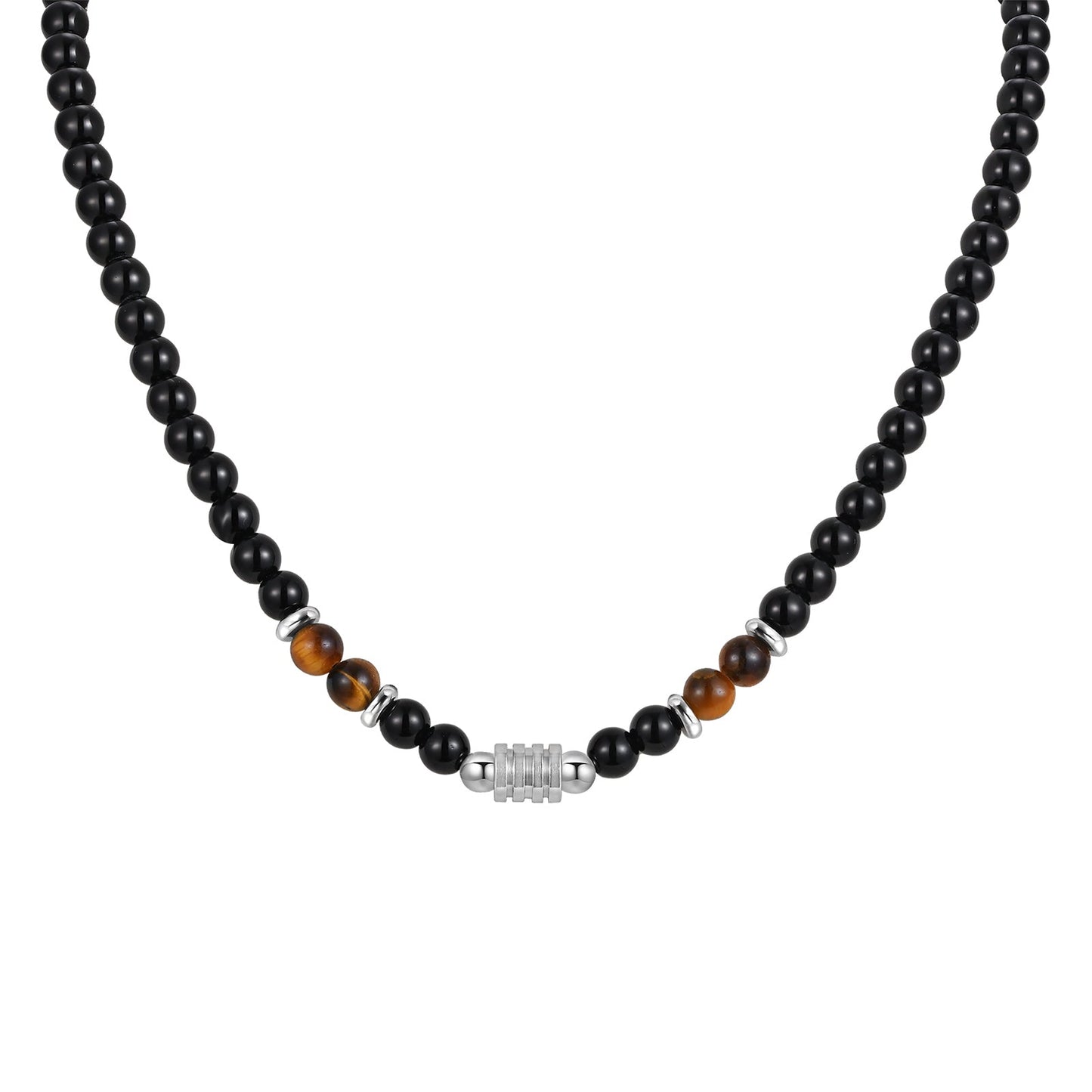 Mit einer Länge von 50 cm und einer Perlenbreite von 0,6 cm liegt die Kette angenehm am Hals und verleiht jedem Outfit sofort eine markante, moderne Ausstrahlung. Die Kombination aus glänzendem Edelstahl, warmen braunen Highlights und dunklen, glatten Perlen schafft einen Look, der kraftvoll, edel und gleichzeitig alltagstauglich ist.